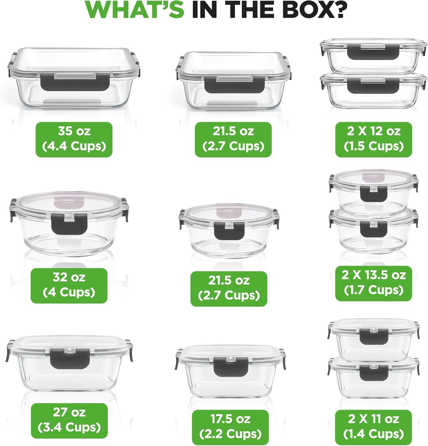Features: – Containers Tolerate Rapid Temperature Changes without Warping or Cracking – Glass Containers won’t Absorb Stains and Smells – Airtight Seal for Food Freshness – Glossy Surface Maintains the Tastiness of Food for Long Term Use – 100% Leak Proof Glass Meal Prep Containers – Great on-the-go & Freezer to Oven Safe Food Containers – 12 Containers with 12 Lids of Various Sizes – Crafted of High Borosilicate Glass – Safe to Transfer from Freezer to Oven in Instants – Containers are Dishwasher Safe – Friendly to the Environment and Free of Chemicals – Easy to Clean and Store – Lids are Crafted of BPA Free Plastic – Newly Innovated Hinged lids Technology – Hinged Locks with Removable Gasket – Oven, Microwave, Freezer Safe – Stain and Odor Resistant – 4 Snap Airtight, Leak-proof Locking Lid What's in the Box: – (2) 12 oz with Lid – (1) 21.5 oz with Lid – (1) 35oz with Lid – (2) 11 oz with Lid – (1) 17.5 oz with Lid – (1) 27 oz with Lid – (2) 13.5 oz with Lid – (1) 21.5 oz with Lid – (1) 32 oz with Lid Technical Specs: – Construction Material: High-Quality Glass – Container Style: Rectangle + Square + Round – Lid Style: Hinged Locking Lid – Capacity: 11 Oz – 35 Oz – Temperature: 520? (Max) , -20?(Min) – 12 oz with Lid (L x W x H): 6.22'' x 4.68'' x 2.20'' -inches – 21.5 oz with Lid (L x W x H): 7.16'' x 5.43'' x 2.48'' -inches – 35oz with Lid (L x W x H): 8.19'' x 6.22'' x 2.72'' -inches – 11 oz with Lid (L x W x H): 4.92'' x 4.92'' x 2.24'' -inches – 17.5 oz with Lid (L x W x H): 5.63'' x 5.63'' x 2.44'' -inches – 27 oz with Lid (L x W x H): 6.42'' x 6.42'' x 2.68'' -inches – 13.5 oz with Lid (L x W x H): 5.55'' x 5.55'' x 2.36'' -inches – 21.5 oz with Lid (L x W x H): 6.34'' x 6.34'' x 2.72'' -inches – 32 oz with Lid (L x W x H): 7.20'' x 7.20'' x 2.91'' -inches