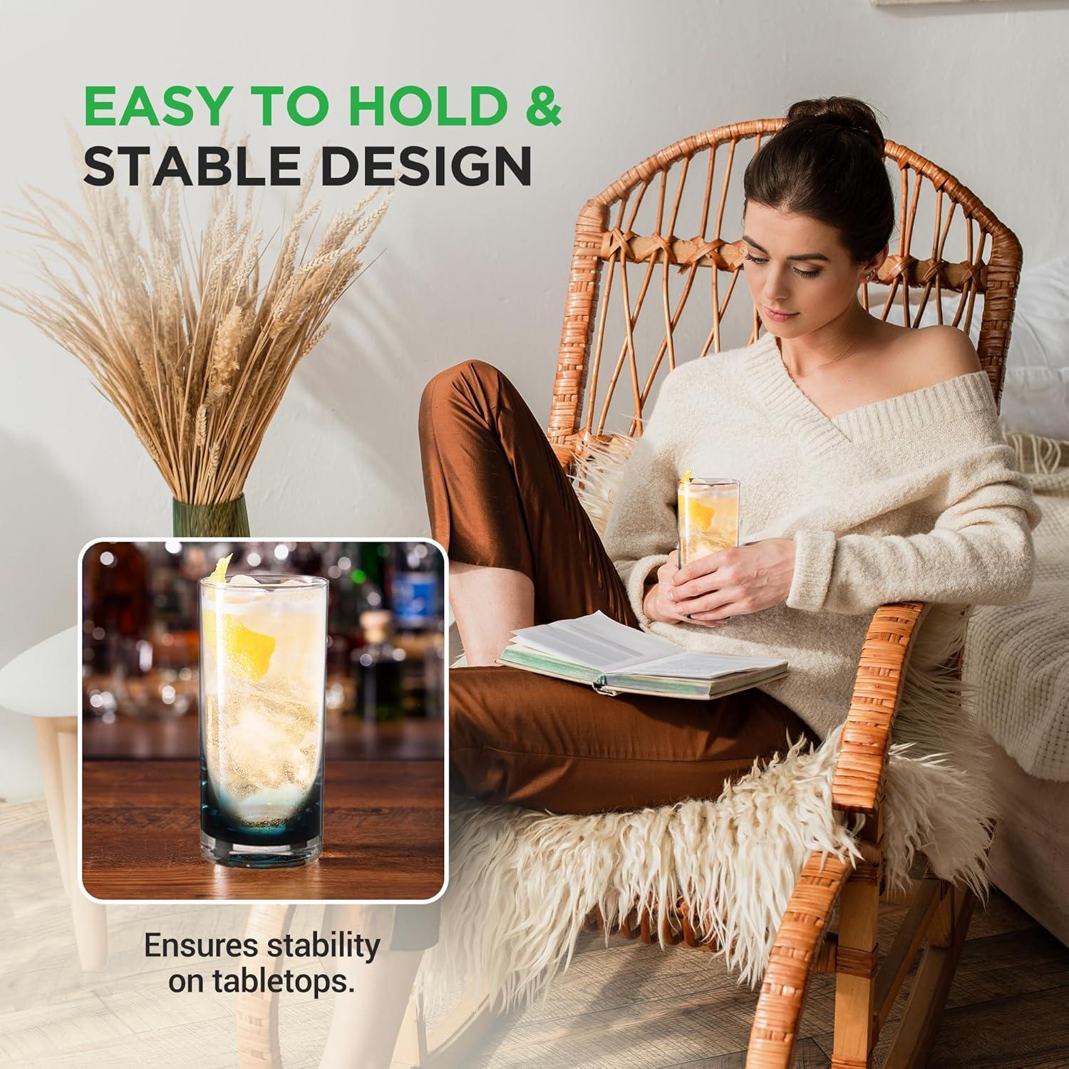 12.5 OZ CAPACITY: Each glass has a capacity of 12.5 ounce w/ height of 5.75”, 2.64” top diameter & 2.44” bottom diameter. Features a signature flat foot for increased stability on tabletop & the highball design feels natural & comfortable in the hand