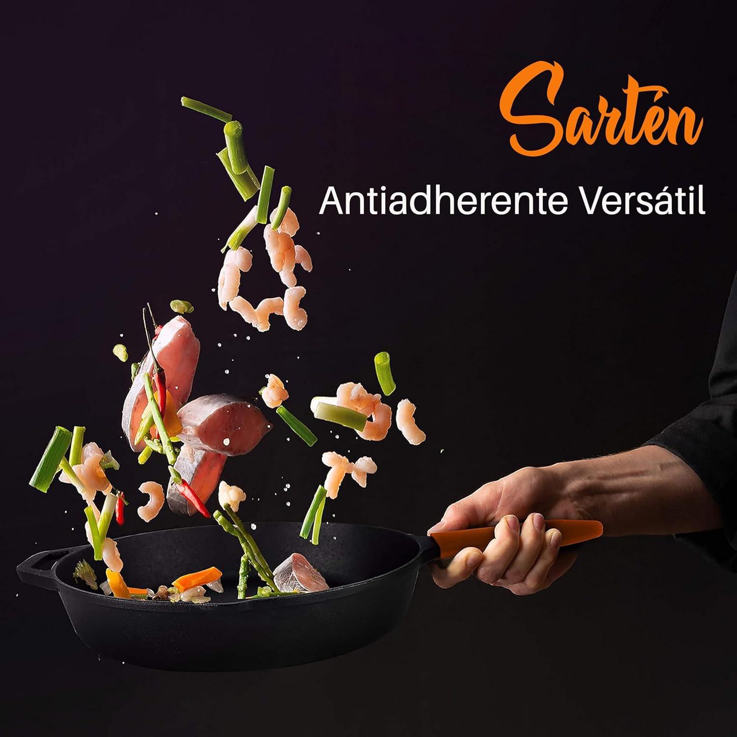 HEAT SAFE UP TO 500° F: The nonstick skillet cast iron pan is heat-safe at high temperatures up to 500°F (200° Celsius). Features wide diameter size for large meals & includes cool touch orange silicone handles & glass lid cover