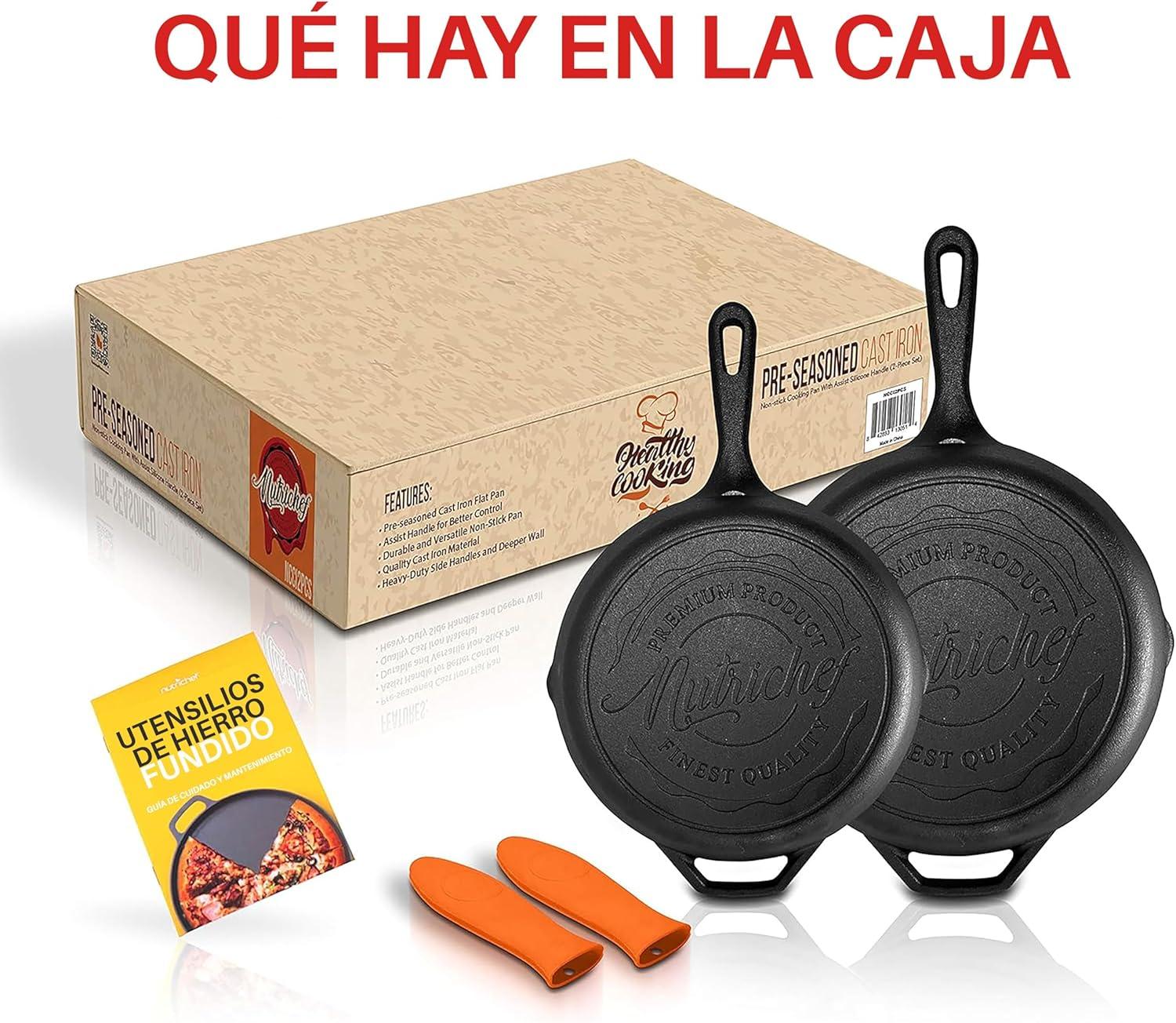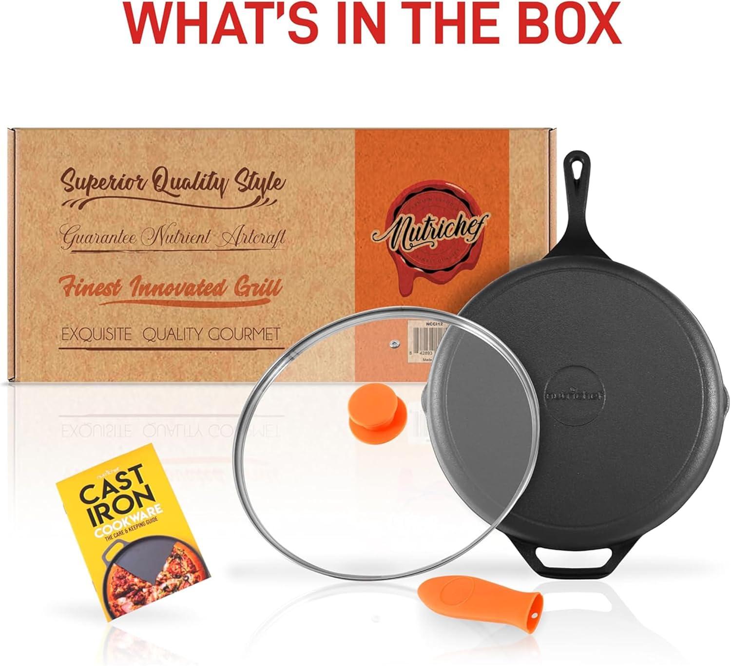 NutriChef 12-Inch Cast Iron Skillet w/Lid – Pre-Seasoned, Oven Safe, Nonstick, Cool-Touch Silicone Handle, For All Cooktops – NCCI12(Black)