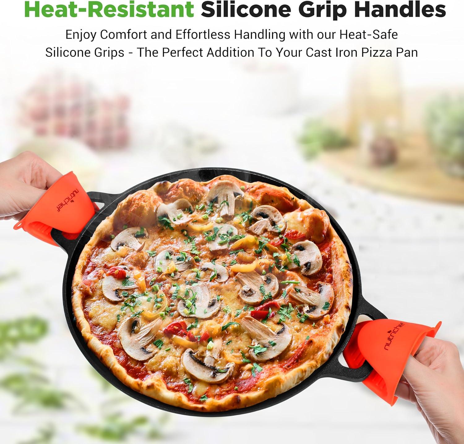 HEAT SAFE UP TO 500° F: NutriChef pre seasoned cast iron pizza pans are heat-safe at high temperatures up to 500°F (260°C). Features wide diameter size for large meals & includes 2 orange silicone handles. Also ideal for chicken, steak & veggies