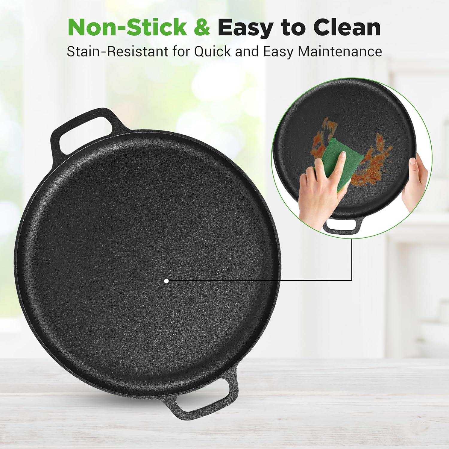 Features: – Pre-seasoned Cast Iron Flat Pan – Durable and Versatile Non-Stick Pan – Great for pizza – Quality Cast Iron Material – Heavy-Duty Side Handles and Deeper Walls – Easy Grip & Curving Handles – Extended Finger Space – Smooth Griddle Surface – Enhances Heat Retention and Dispersion – Easy to Clean & Maintain, No Soap or Dishwasher Use – Used on Gas, Electric, Glass, Induction Cooker, Oven, and Grill/Campfire What’s in the Box: – (1) Cast Iron Pizza Pan – (2) Silicone Handles Technical Specs: – Construction Material: Cast Iron – Maximum Temperature Reached: 500° Fahrenheit (260° Celsius) – Product Dimension: 13.25'' x 13.25'' x 1.20'' -inches