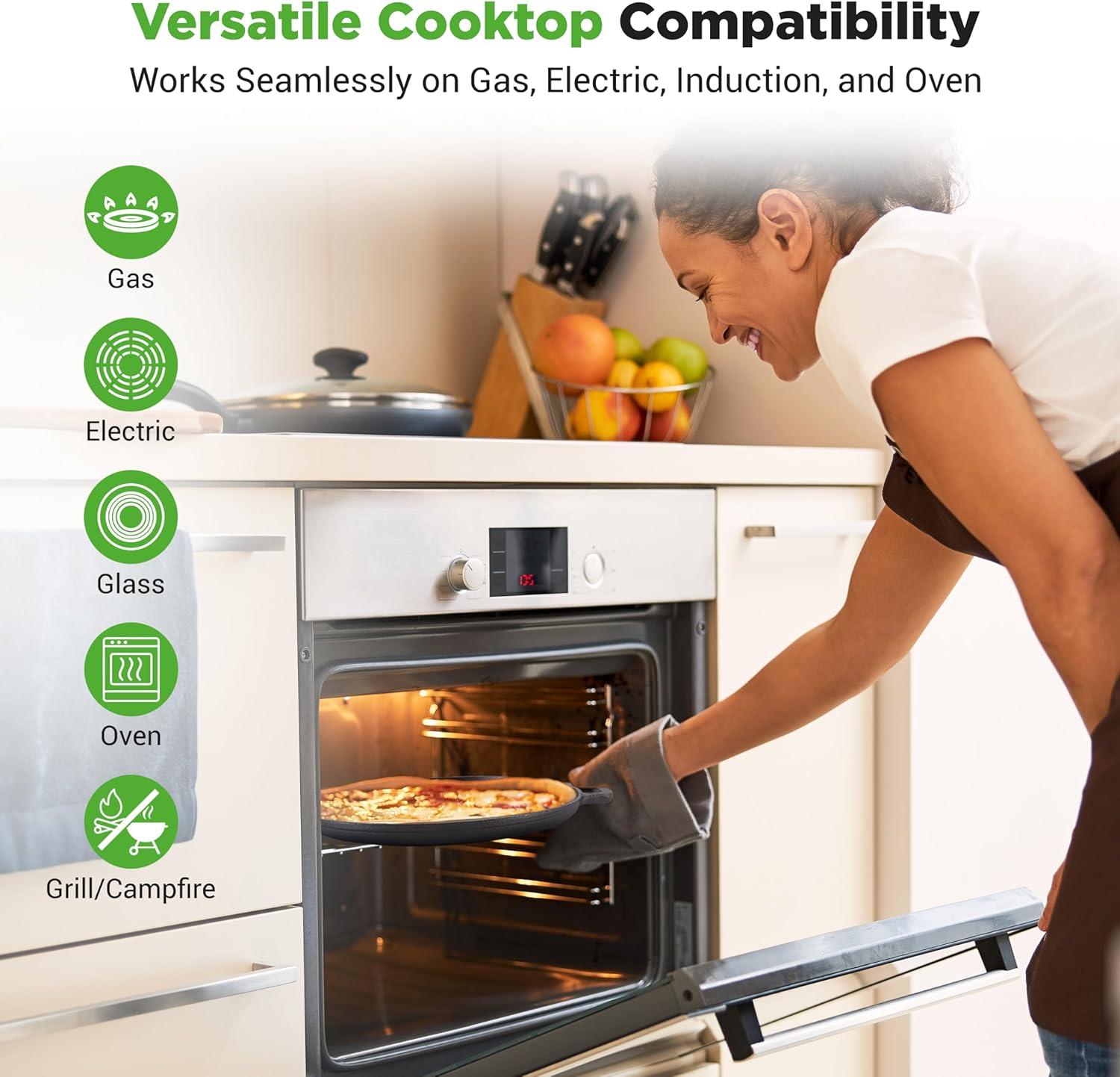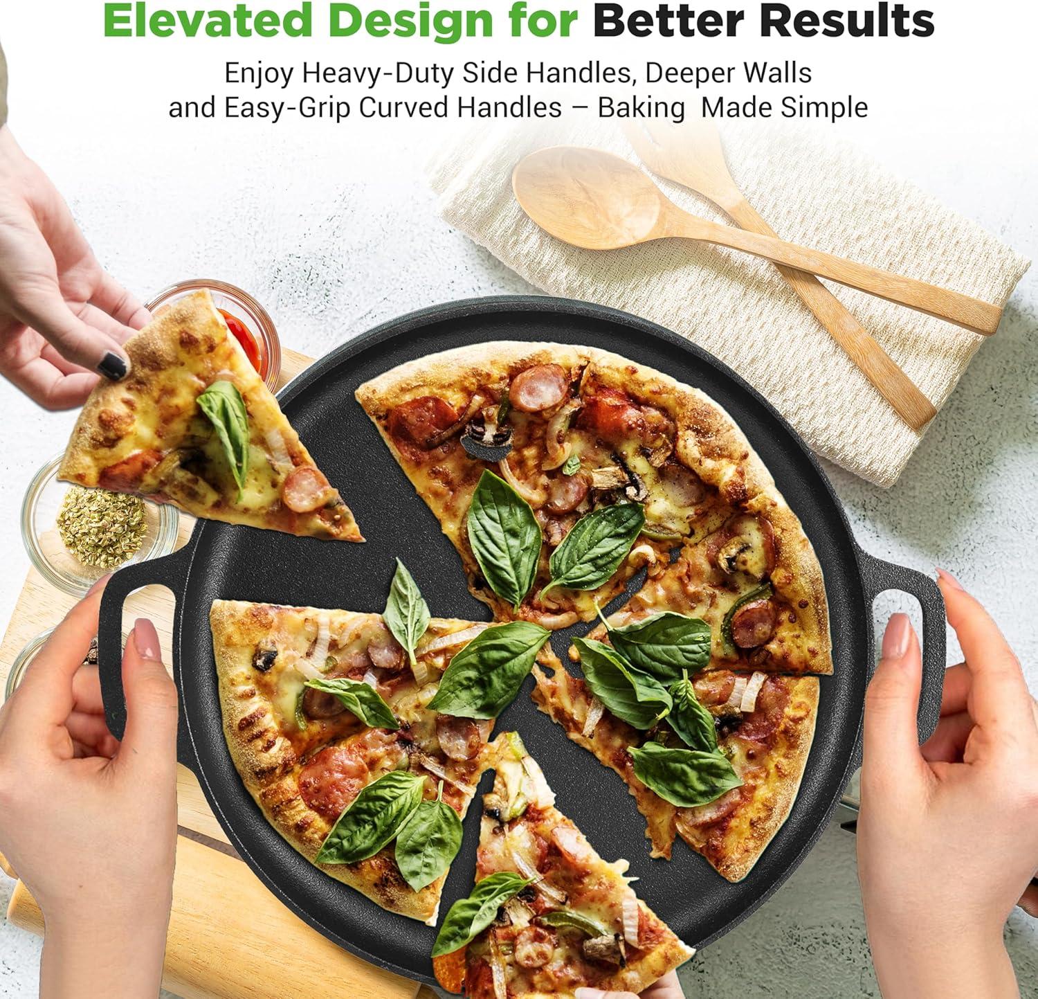 INDUCTION READY: The stain-resistant easy to clean nonstick cast iron pizza pan 13 inch is compatible w/ all heating methods. Safe for gas, electric, glass, induction cooker, oven, & grill/campfire. Enjoy traditional cooking style w/ the whole family