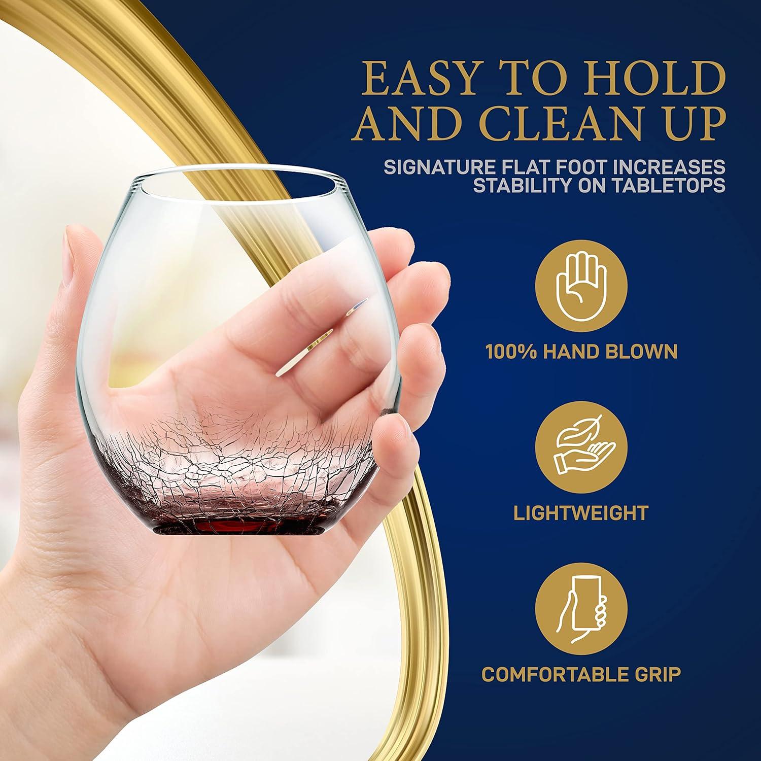 Features: Easy to Hold and Clean Up Durable and Dishwasher Safe Made From Lead-Free Premium Crystal Glass 100% Hand Blown, Ice Crack Effect Classy and Reusable Packaging Shatter-Resistant Wine Glasses Environmentally Friendly and High-Grade Filling Materials Signature Flat Foot Increases Stability on Tabletops Chip-resistant with Normal Use Lighter and Elegant with Excellent Flow Linearity Ensures Stability and an Innovatively Style Hand Made with the Highest Quality of Crystal What's in the Box: 4 Sets of Crystal Stemless Wine Glasses Technical Specs: Construction Materials: Crystal Glass Capacity: 19 Oz. Height: 4.33’’ -inches Top Diameter: 2.64’’ -inches Bottom Diameter: 1.97’’ -inches Maximum Diameter: 3.94’’ inches Sold as: 1 set Weight: 3.47 lbs.