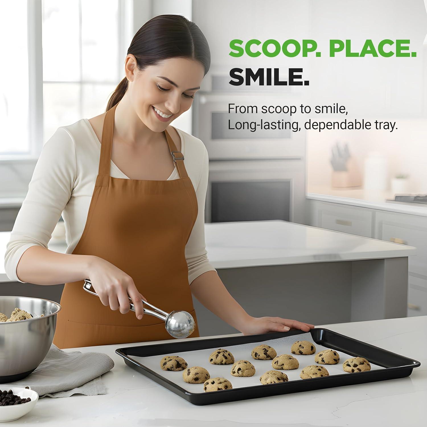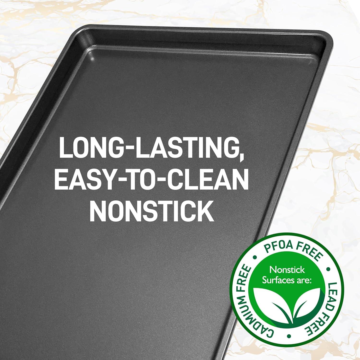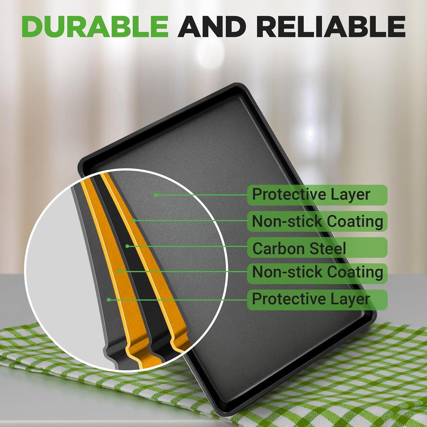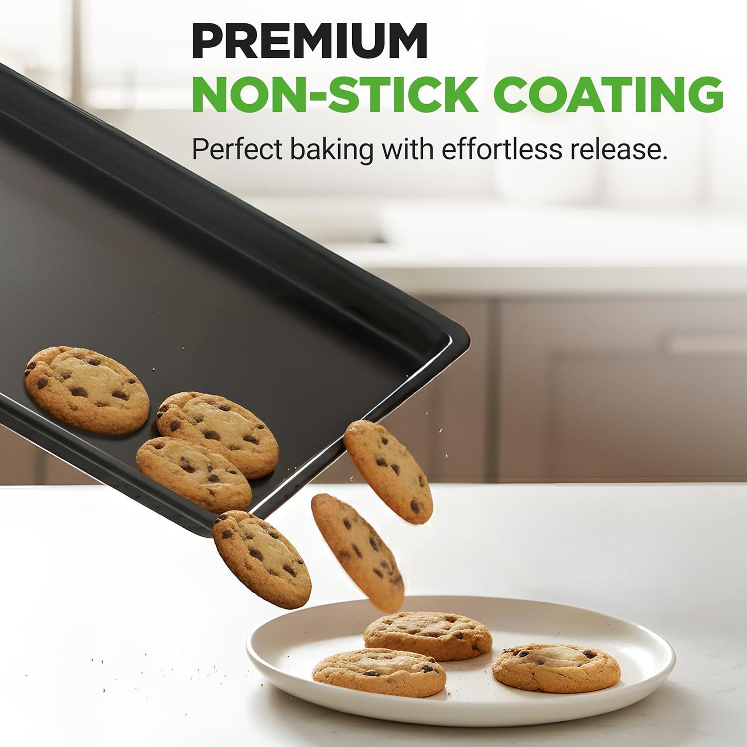 NON-STICK COATING: The large cooking sheet pan features a non-stick coated layer surface that ensures quick, effortless food release and eliminates the need for butter, oil, or cooking spray. Makes tasty homemade baked goods slide out easily