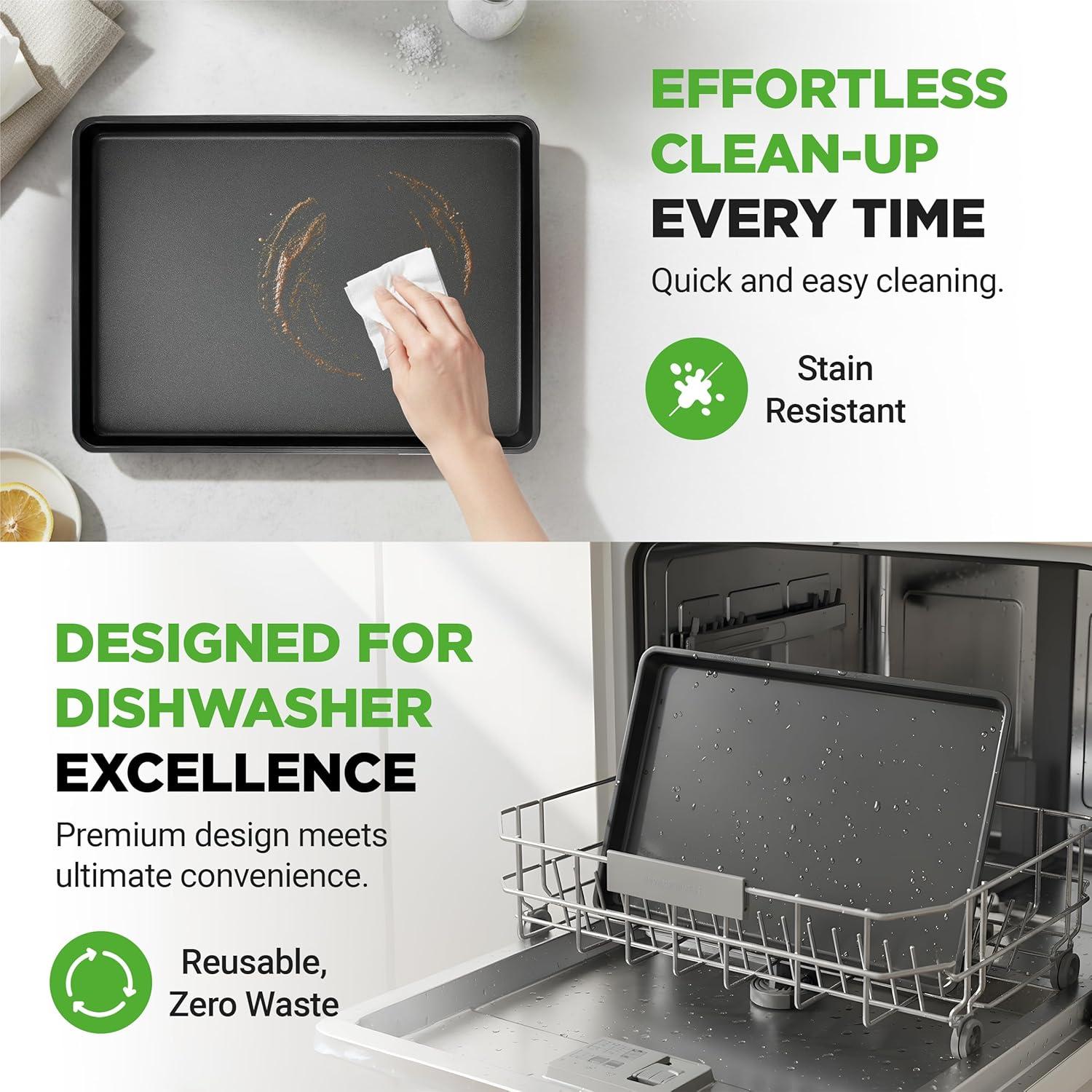 DISHWASHER SAFE: Use this oven trays non stick pans for baking pastry dessert, food prep/serving without the hassle of cleaning. Just rinse under water or run through the dishwasher. Handwash recommended to extend pan life