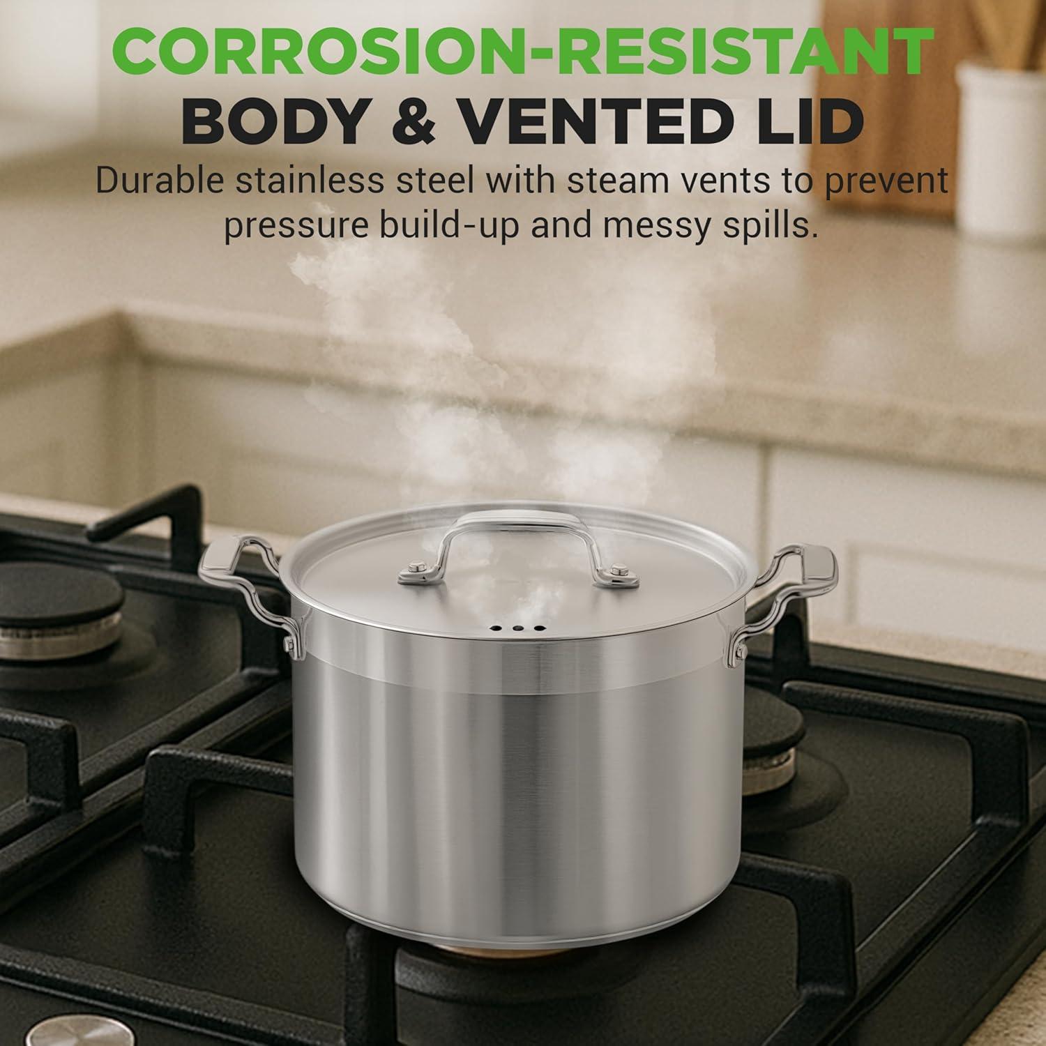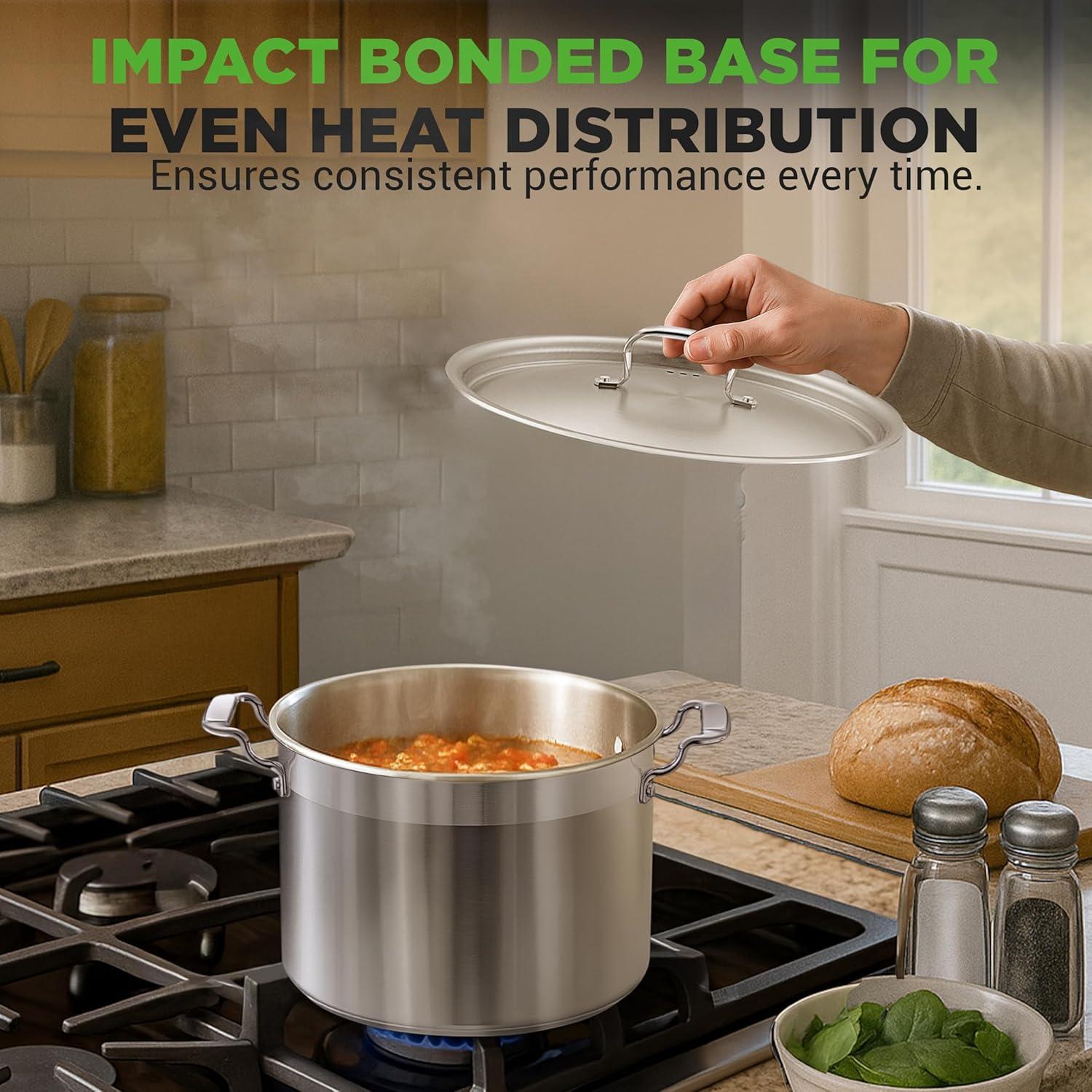 DURABLE STAINLESS STEEL CONSTRUCTION – Made from heavy-duty stainless steel, this stockpot is built to last. The impact-bonded base ensures even heat distribution for superior cooking performance.