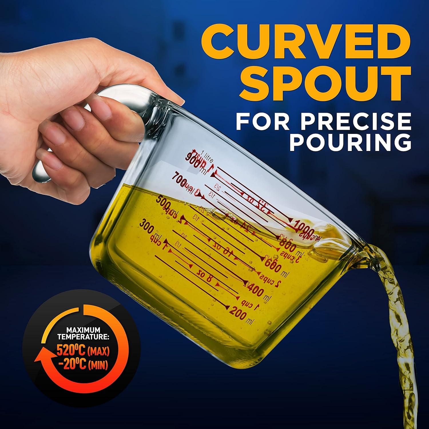 EASY-GRIP HANDLES: Features easy-to grip handles for better cooking experience. It also features a curved spout for precise pouring & clear measurements in cups using ounces and milliliters. The cups are heat-resistant & can handle temp of up to 520℃
