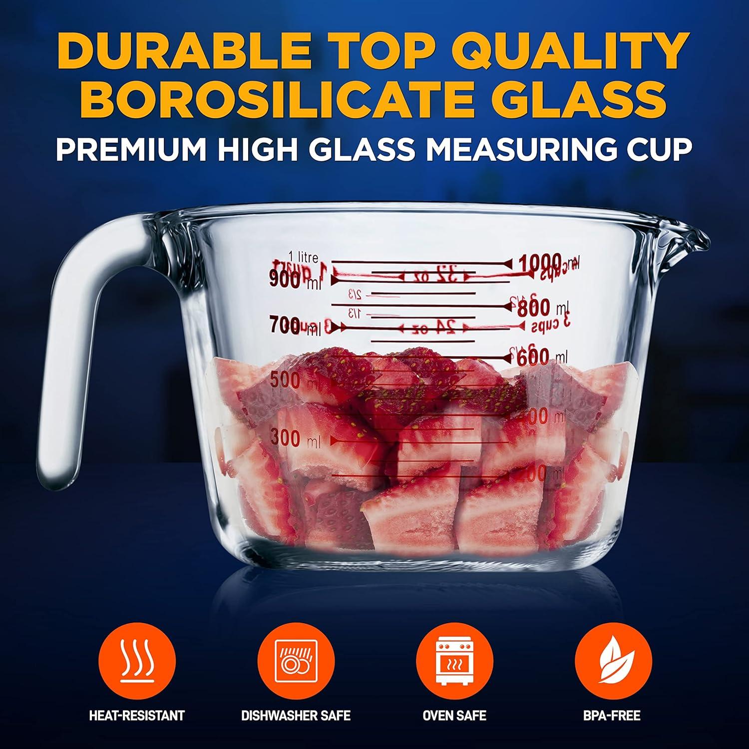 3-PIECE: The glass measuring cup set includes (1) 1-cup or 250ml, (1) 2-cup or 500ml, and (1) 4-cup or 1000ml. The cups are safe for oven, microwave, and freezer use. Perfect for baking, cooking, and mixing ingredients