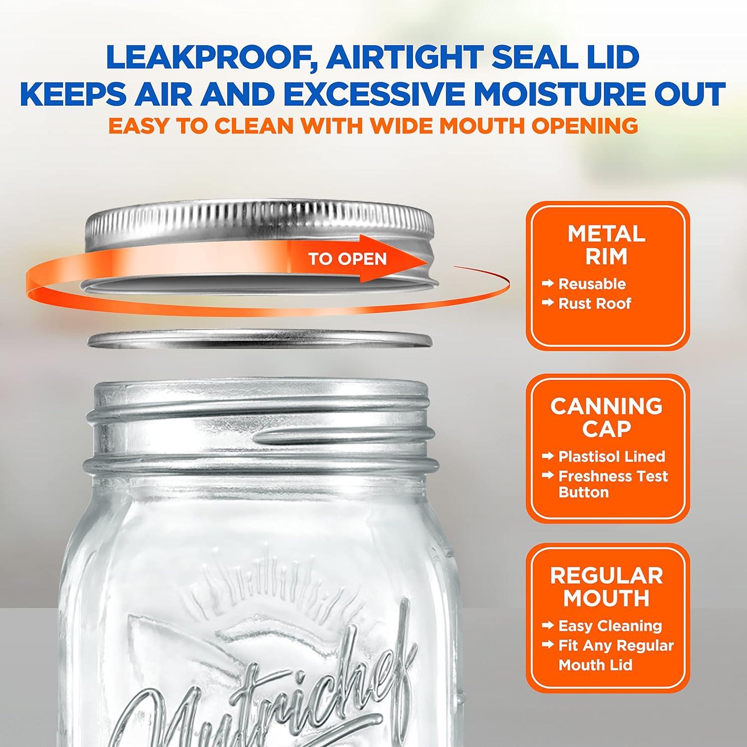 NutriChef 4-Pack 16 oz Mason Jars with Lids - Thick Glass Canning Jars with Stainless Steel Lids - Ideal for DIY Spices, Meal Prep, Overnight Oats, Jelly, Jam, Honey, Candles, Crafts, & More(4 Pack)