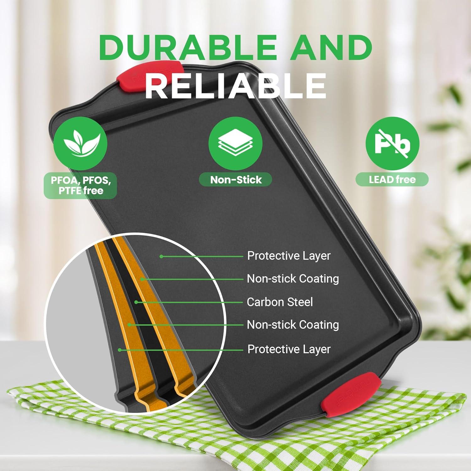 HEAT-RESISTANT AND DURABLE DESIGN – Built to withstand temperatures up to 446°F, this bakeware ensures safe, even cooking. Reinforced grips provide a secure hold and the carbon steel design prevents warping over time.