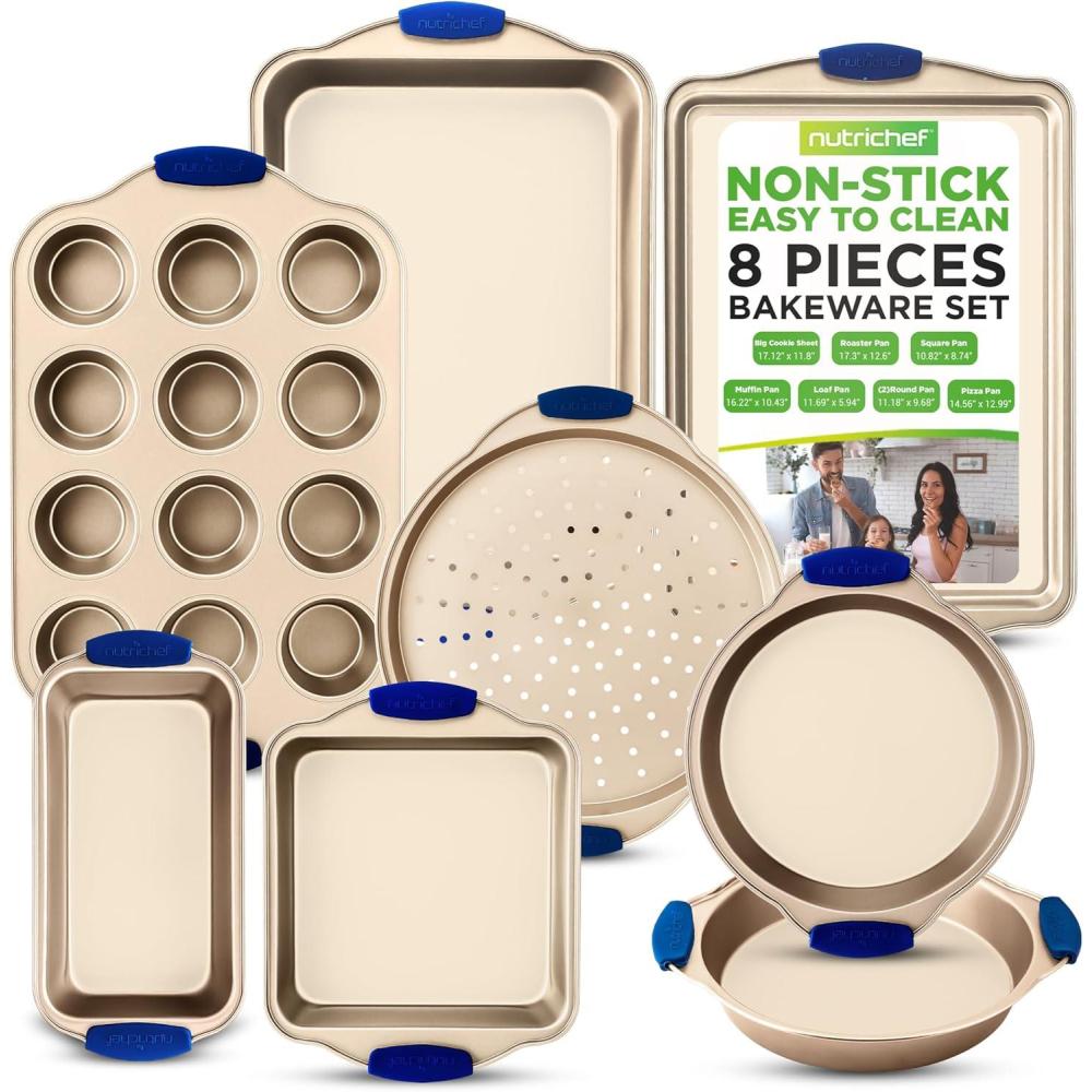 NutriChef 6-Piece Nonstick Bakeware Set - Premium Carbon Steel Baking Trays w/Heat-Safe Silicone Handles - Includes Loaf Pan, Muffin/Cupcake Pan, Round & Square Roaster Pans, Cookie Sheet - NCSBSG36(8 Pieces Set)