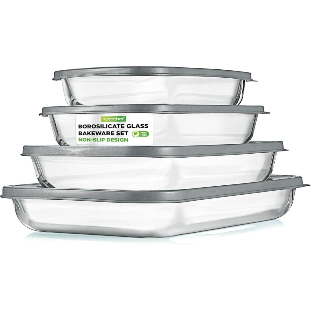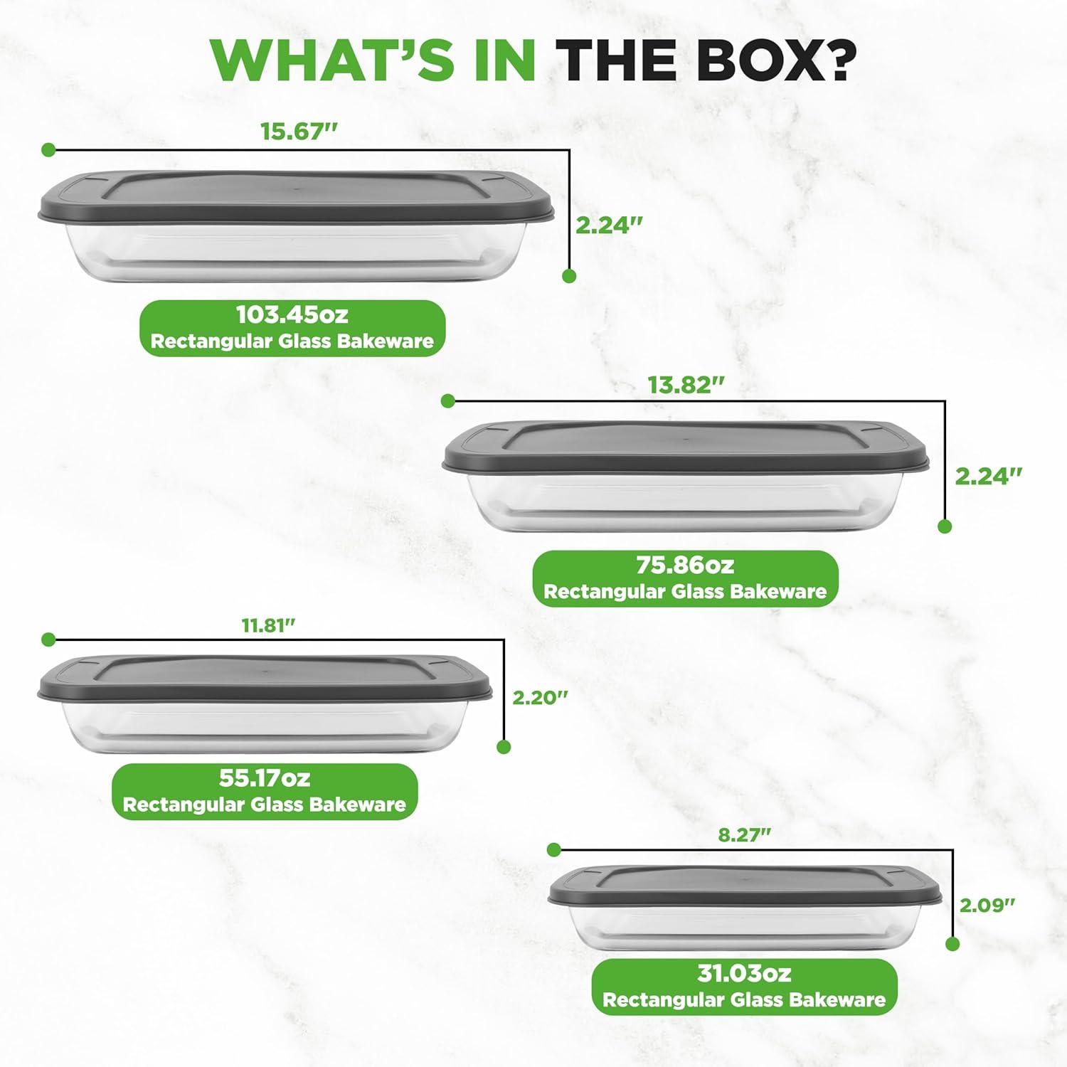 4 RECTANGULAR SETS: The 8-Piece Bakeware Set offers a complete high-quality cooking or baking dish for casseroles, lasagna, or for storing leftovers. Includes 0.9-quart, 1.7-quart, 2.4-quart & 3.2-quart capacity baking dishes with 4 BPA-free lids