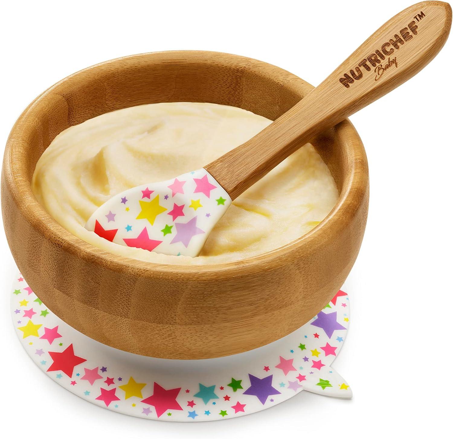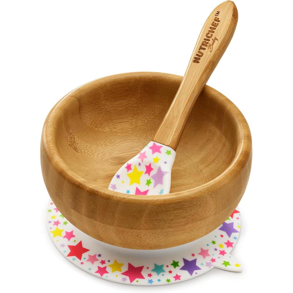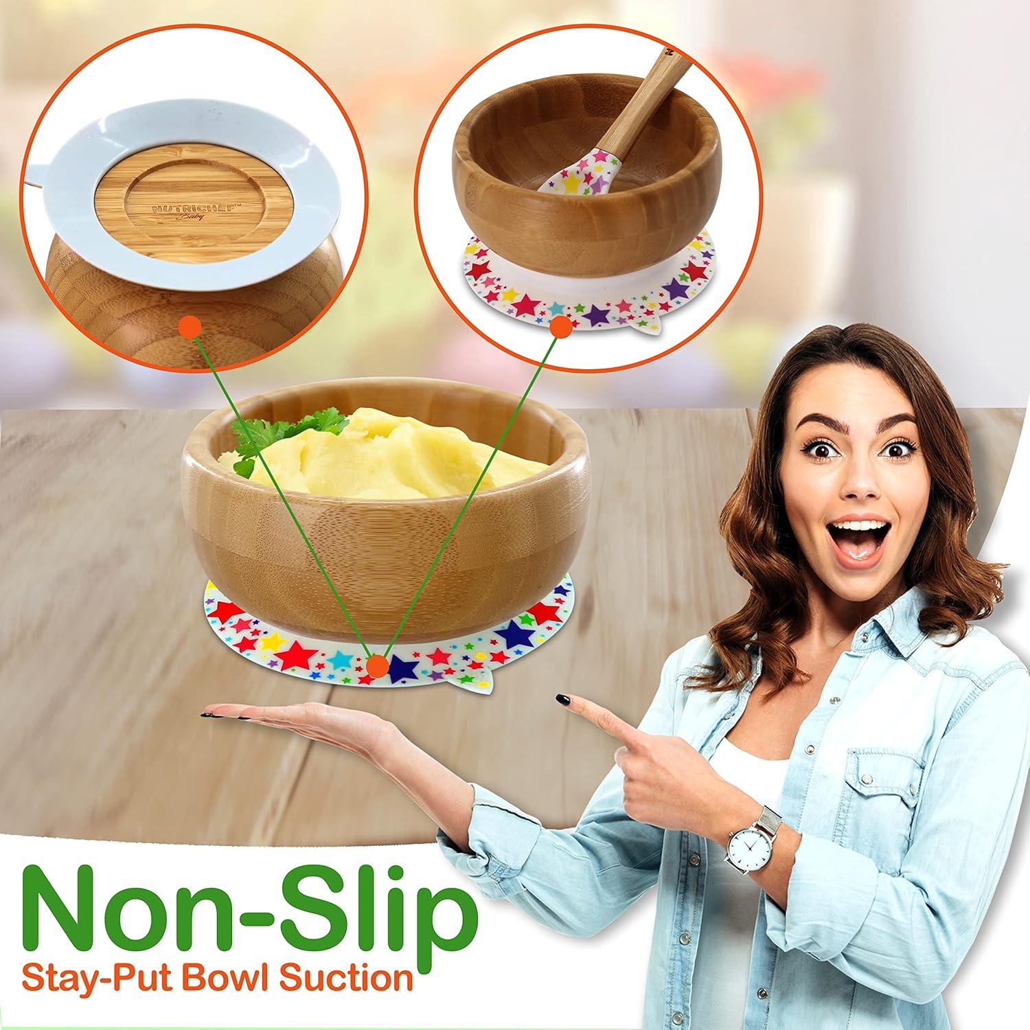 BAMBOO MATERIAL: These stay put suction bowls are sourced from natural bamboo. Bamboo dishware is a great natural choice for infant feeding, baby-led weaning or toddler self-feeding. Includes spoon w/ food-grade silicone tip that is gentle on gums