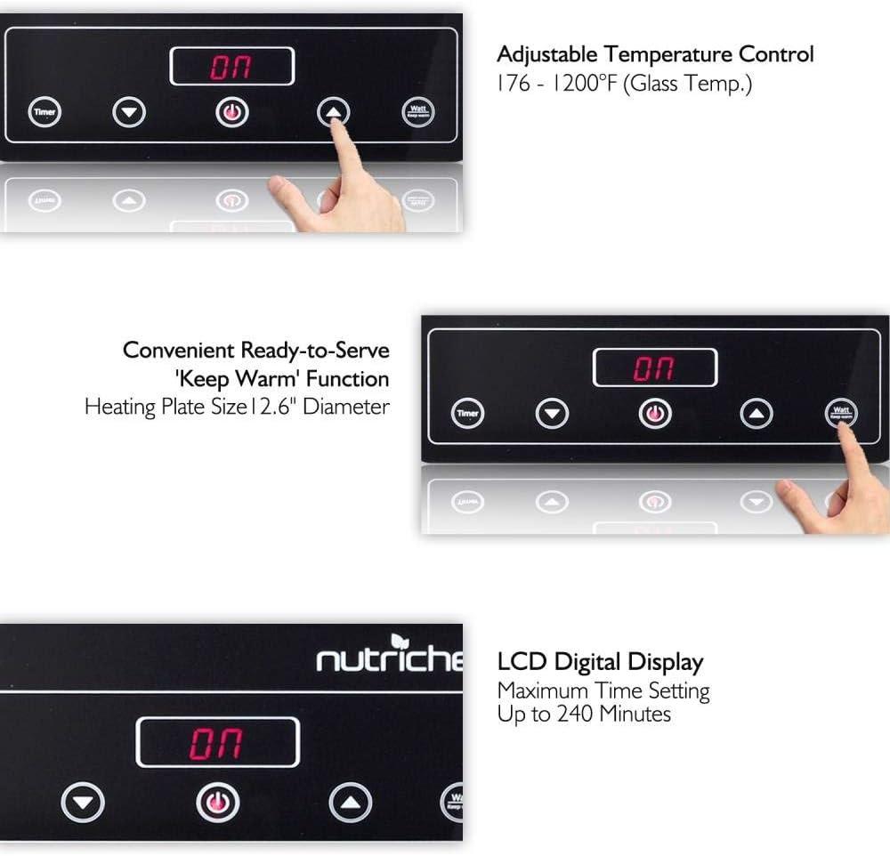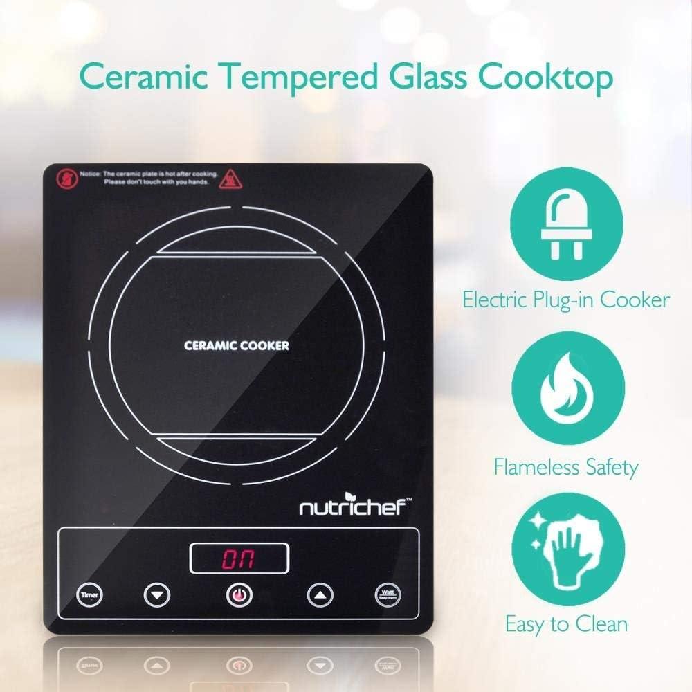 The NutriChef Ceramic Cooktop provides convenient & hassle-free food prep. The tempered ceramic glass cooker features a simple plug-in design that is safe for table or countertop placement. High-powered heating element quickly heats and adjustable temperature controls will help you prepare all of your favorite foods. The ceramic glass burner cooker also features the unique Ready-to-Serve ‘Keep Warm’ function to plate warm food — perfect for any meal of the day. Additional system features include the front panel touch button controls, LCD digital display, non-stick & stain-resistant cooking surface, along with an energy efficient low power consuming design. Enjoy compact cooking convenience with the NutriChef Ceramic Glass Cooktop.