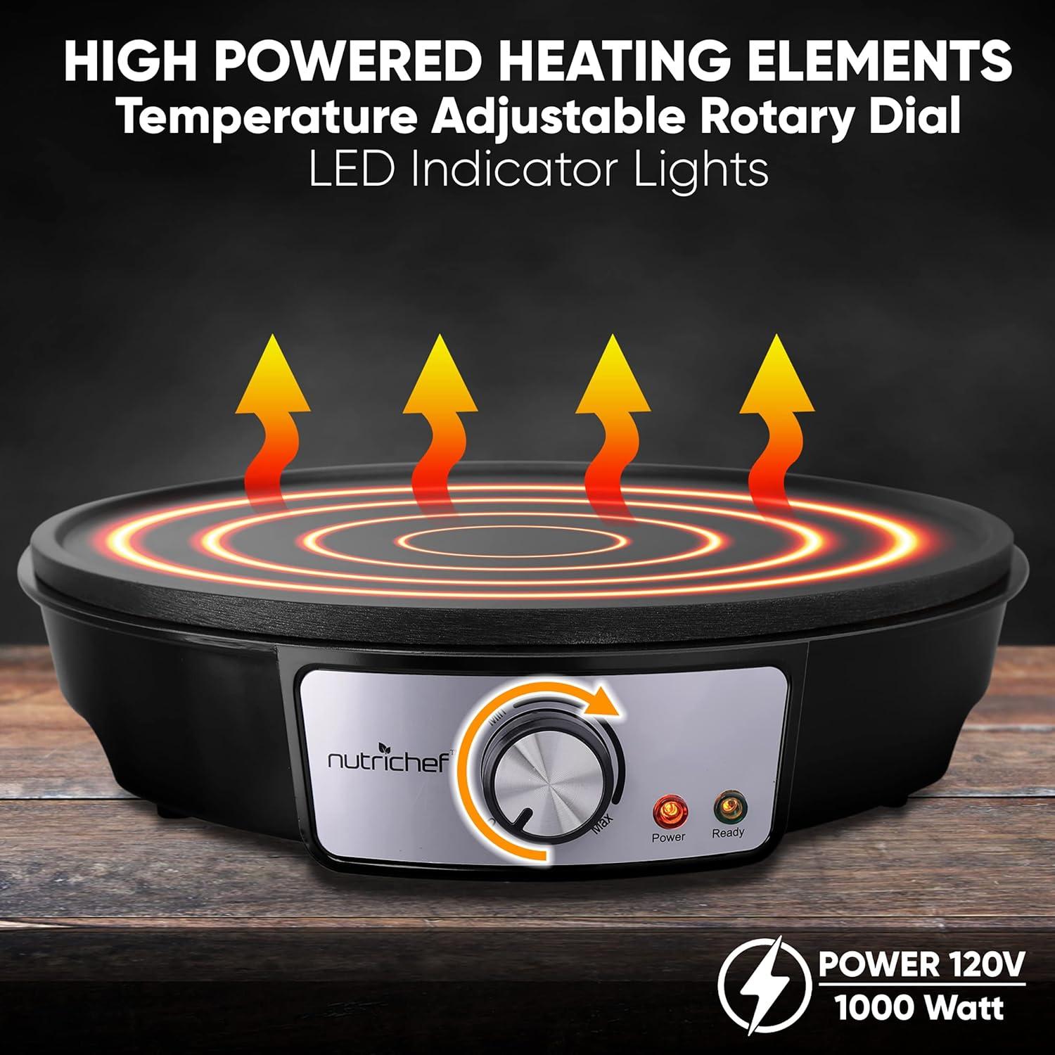 NutriChef's Electric Griddle Hot Plate provides you with quick & convenient food prep ability. The compact tabletop design is easy to use, allowing you to create delicious desserts like crepes and blintzes or use it to whip up a bacon, egg & pancake breakfast! The non stick aluminum cooking surface features a wide 12'' inch diameter cooking surface with a temperature adjustable rotary control knob. Enjoy hassle free hot plate food preparation with the NutriChef Electric Griddle & Crepe Maker.