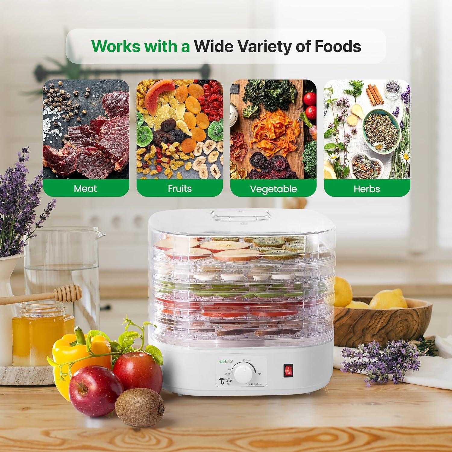 NutriChef Model : PKFD06Compact Countertop Food DehydratorElectric Countertop Food Dehydrator, Food Preserver Features:Multi-Tier Kitchen ApplianceDehydrate Food for Enhanced PreservationSimple One Button Operation with Nutritious ResultsFaster & More Efficient Alternative to Standard DehydrationEffectively Dries Food by Removing Moisture ContentScientifically Tested to Increase Food Shelf LifeGreat for Food Storage: Drying Causes Food to ShrinkDehydration Retains up to 97% of Vitamins & MineralsHealthier Alternative than Canning or FreezingPrepare Healthy Snacks for All AgesDries Your Food to Reduce SpoilageStain Resistant & Easy-to-Clean(5) Stackable Tier Trays for Enhanced Air-FlowHigh-Heat Circulation Travels Through Each TrayWorks with a Wide Variety of FoodsMeat, Fish, Poultry, Fruits, Vegetables and MoreUse for Meats to add in Stews, Soups, etc. Technical Specs:Reaches Maximum Temperature of 180 °F Single Food Tray Size (L x W x H): 11.0'' x 11.0'' x 1.2''Assembled Dimensions (L x W x H): 11.0'' x 11.0'' x 10.2''Power: 120VSimply insert your food into the trays and hit the switch to activate a new and healthier level of food preparation. The NutriChef Kitchen Dehydrator effectively works to remove moisture, drying your food and reducing spoilage. The compact tabletop size and multi-level trays allow for enhanced air-flow, dehydrating food for prolonged shelf-life & preservation. Your food will last longer and the removal of moisture content is far more beneficial than canning or freezing. Dehydration with NutriChef retains up to 97% of the food's nutritional value and is scientifically tested to make your food last longer and best of all, it still tastes great! Once dried, your food will retain their original vitamins, minerals and flavor! Prepare foods like meat, fish, poultry, fruits, vegetables and more! Save time, save money and save valuable cabinet space since the dehydration process shrinks your food, making it great for food storage or stocking up for the winter. It works great with a wide variety of food groups and is perfect for preparing healthy, oil-free veggie chips for the kids or hardy beef jerky for dad. Reduce spoilage and enjoy enhanced food preservation with the NutriChef Food Dehydrator.