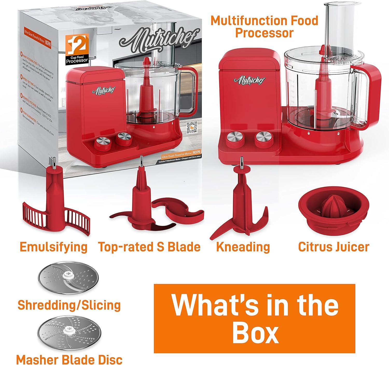 6 ATTACHMENT BLADE: The 12 cup food processor set includes slicer/shredder & masher blade disc, chopper, dough kneading, & emulsifying blades, & citrus juicer to easily mash nuts, shred vegetable/fruit, chop meat, mix flour & more w/ just 1 machine