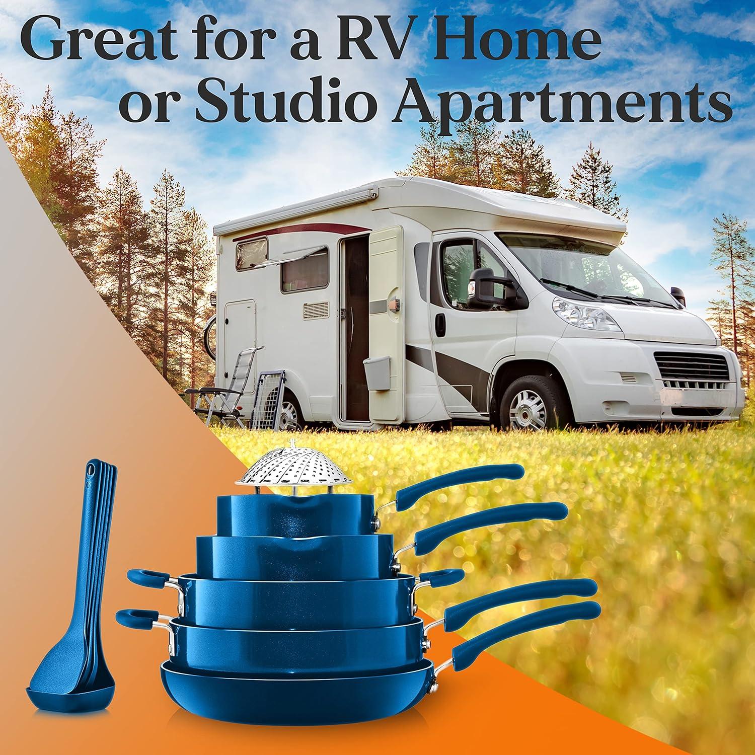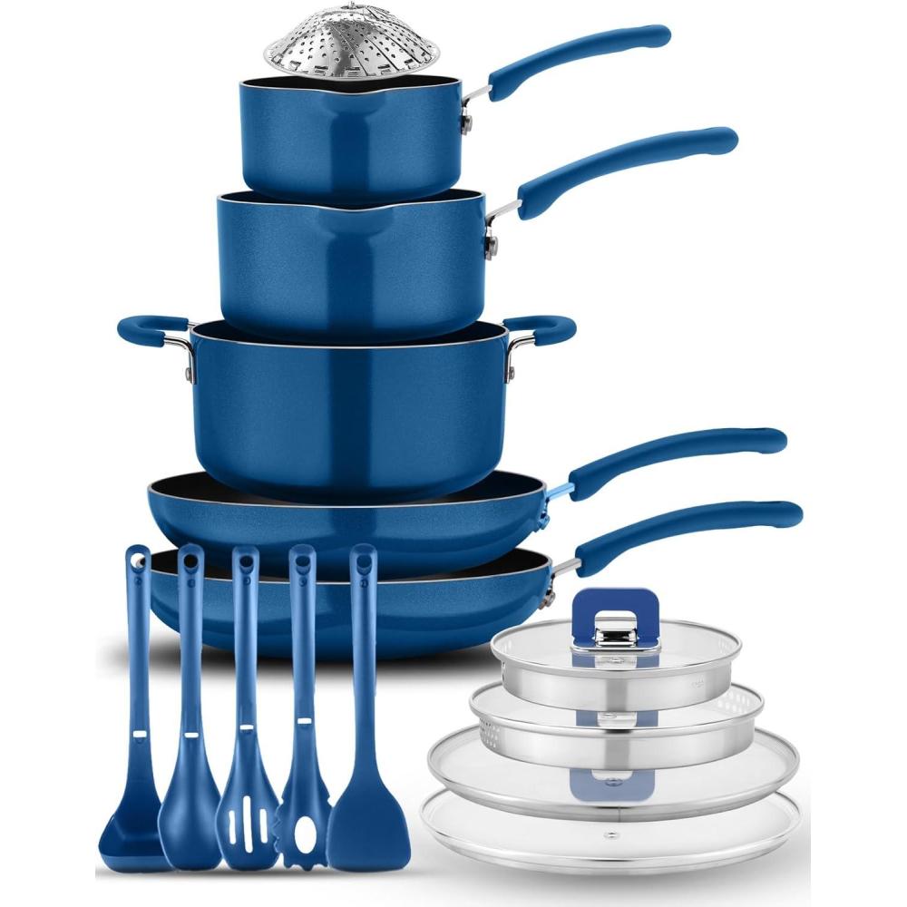 imageNutriChef Kitchenware Cookware NonStick Pans and Pots with foldable Knob Space Saving Stackable Nylon Tools Induction Base Brown 17Pc SetBlue