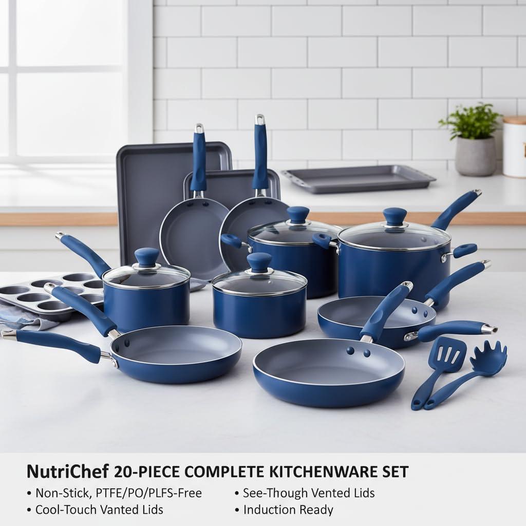 NutriChef Kitchenware Pots & Pans Set – High-qualified Basic Kitchen Cookware Set, Non-Stick (20-Piece Set)(Blue)