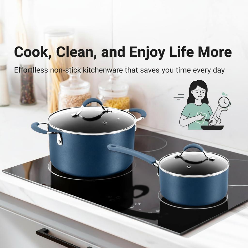 NON-STICK SURFACE: This cookware set boasts a durable, PFOA/PFOS-free non-stick coating, ensuring effortless food release, easy cleaning, and healthier cooking. Its heat-resistant lacquer exterior stands up well to high temperatures.