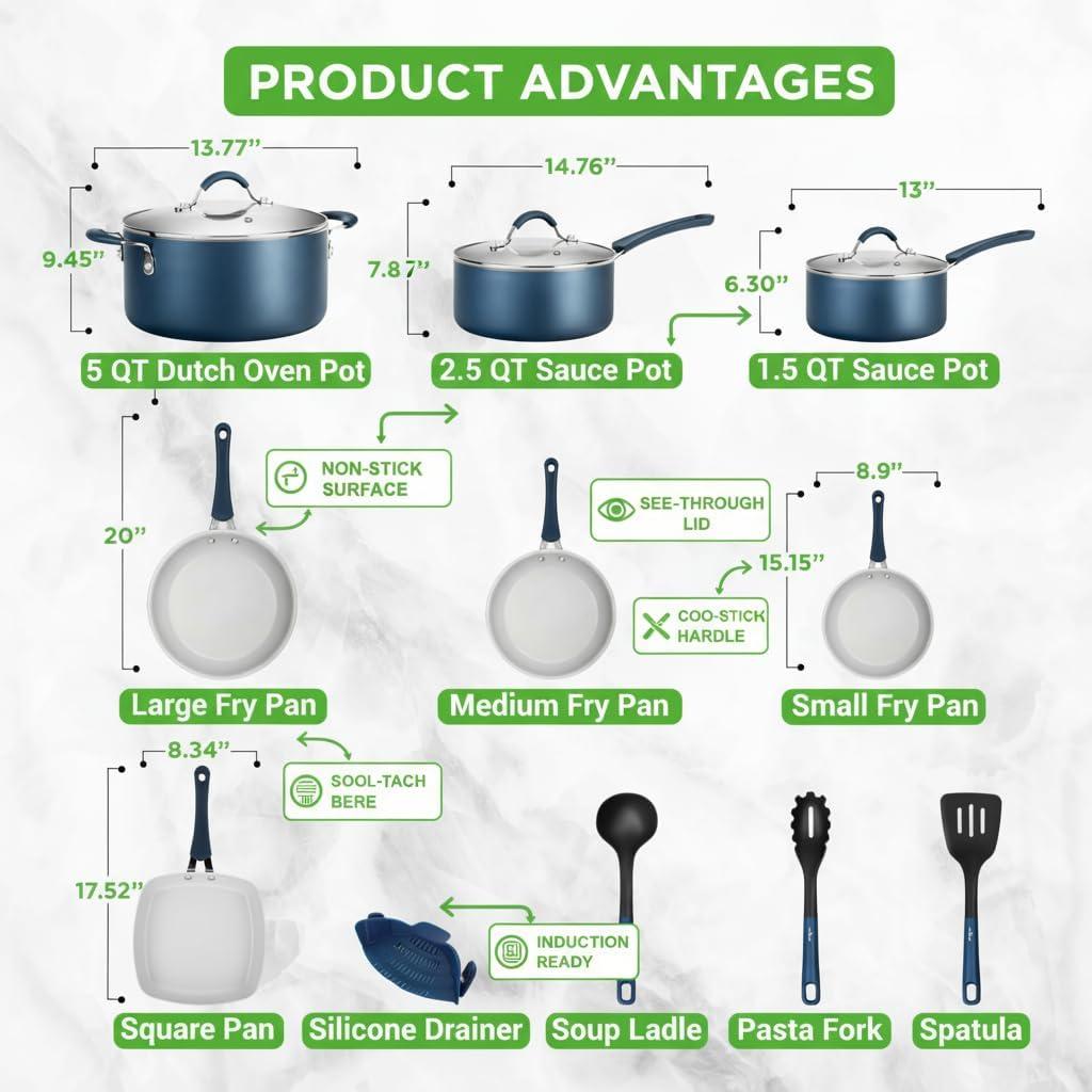 INDUCTION READY: The pots & skillet fry pans are safe for use in gas, electric, ceramic & induction Counter Cooktops. Made of reinforced pressed aluminum w/ 18-25um, 2.5mm multi-layered coating thickness. Includes scratch free nylon silicone utensils