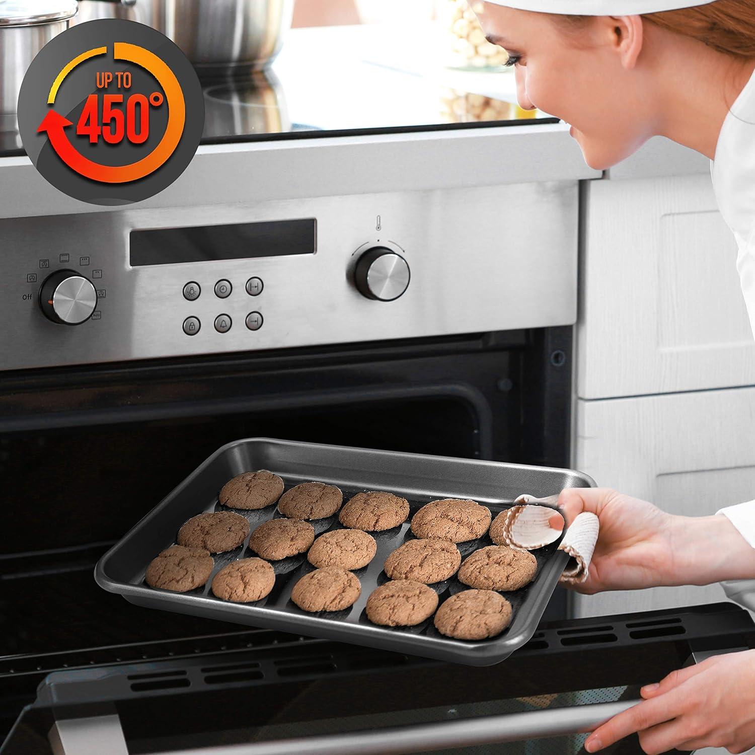 DURABLE BAKEWARE SET: These cookie pans are made from carbon steel & non-stick coating that resist warping to keep your baking and toasting for years. It is suitable for ovens, convection & toaster ovens. A reliable cookie sheet oven pan style