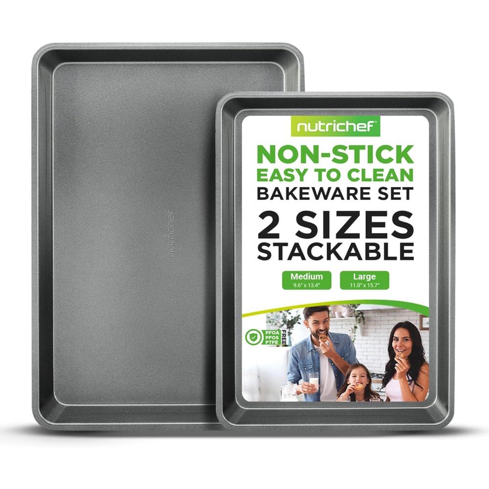 2-PIECE SET: NutriChef 2-piece nonstick cookware set includes large bake pan and medium bake pan. These are a flexible, stylish and non-stick carbon steel bakeware set with an attractive and stylish metallic coating