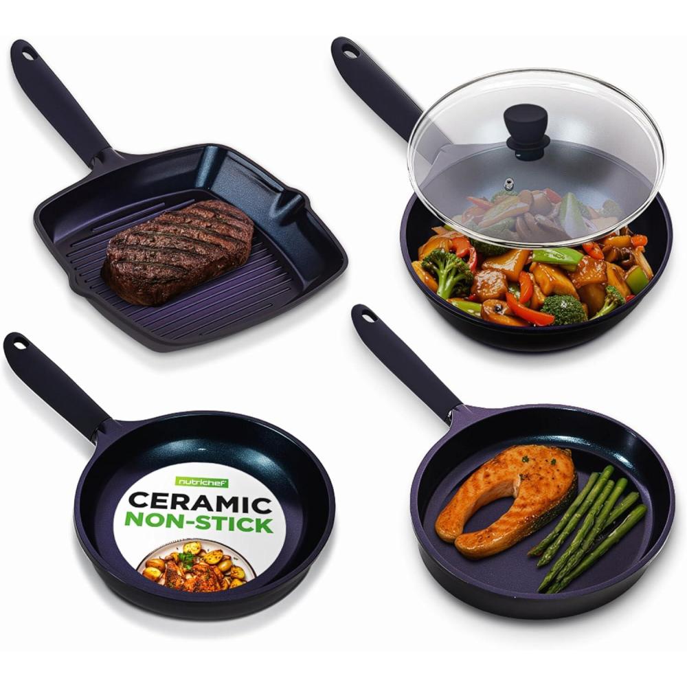 Elevate your kitchen experience with the NutriChef 5-Piece Stovetop Frying Pan Cooking Set in a striking Blue Diamond finish. This professional pan set includes a fish pan, fry pan, grill pan, and a versatile wok pan with a see-through tempered glass lid. Each piece is crafted from die-cast aluminum and coated with a durable, multi-layered ceramic that ensures non-stick performance and even heat distribution for perfectly cooked meals every time. The cool-touch Bakelite handles offer a comfortable and secure grip, while the stain-resistant, easy-to-clean surface makes post-cooking cleanup a breeze. Designed for modern kitchens, these non-stick frying pans are safe for use on gas, electric, ceramic, and induction cooktops, and are oven-safe up to 400°F. Made with environmentally friendly and food-grade safe materials, this pan set is PTFE, PFOA, and PFOS-free, giving you peace of mind while preparing healthy, delicious meals. Whether you're searing, grilling, or stir-frying, this ceramic pan set provides reliable performance and a touch of elegance that complements any kitchen.