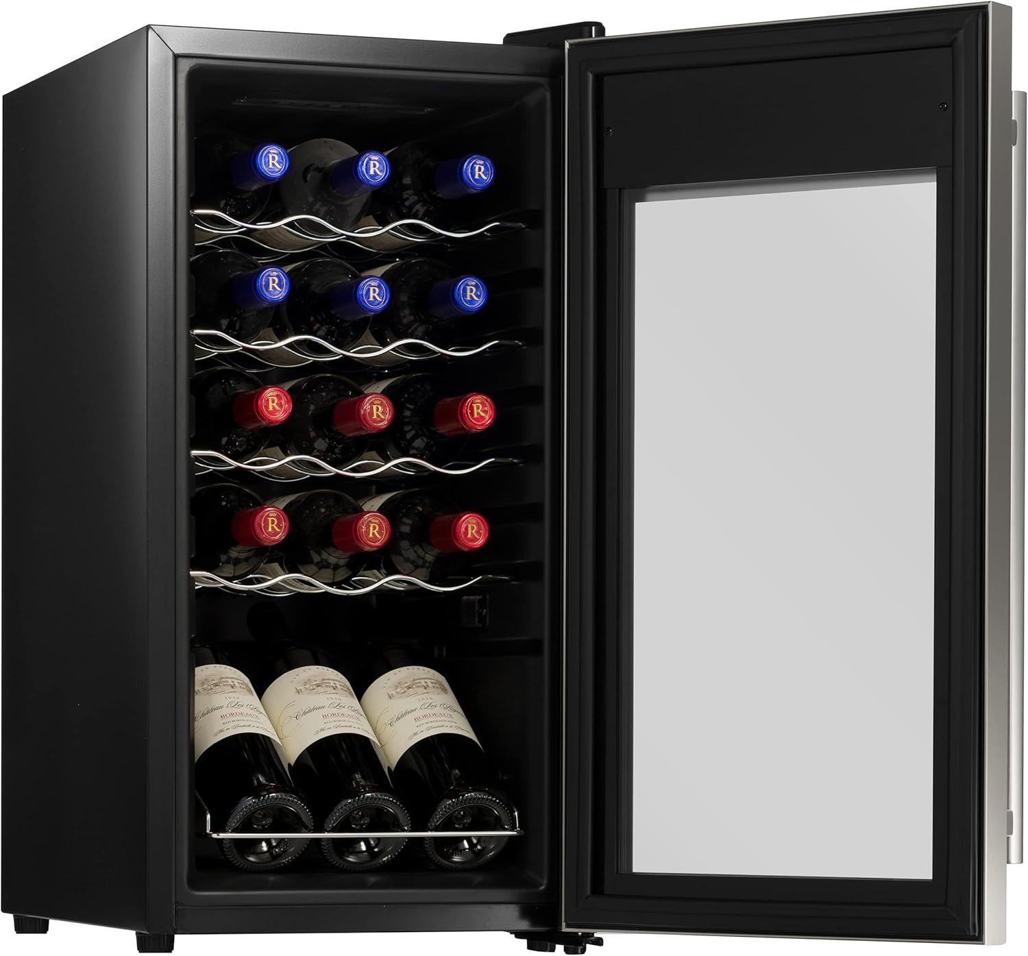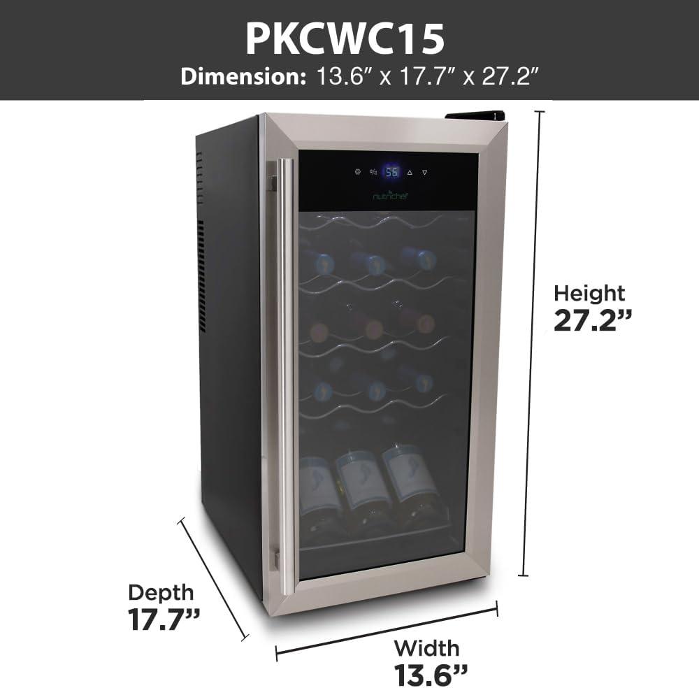 Introducing the Wine Chilling Refrigerator Cellar – Single-Zone Wine Cooler/Chiller, a sophisticated solution for wine enthusiasts. With a 34-bottle storage capacity, this cooler features a recessed handle, contoured and polished chrome wine racks, and a glass door with a plastic frame for a sleek, modern look. The advanced compressor fan cooling technology ensures optimal temperature control and air circulation, supported by a built-in circulation fan and ventilation grill. Easily adjust and monitor the temperature with the sensitive touch screen control button on the glass door and the digital touch button display panel, with a range from 41°F to 64°F (5°C to 18°C) and selectable Celsius or Fahrenheit display. The integrated LED light with power control and blue temperature display adds to its elegant design. This free-standing wine cooler is perfect for floor, table, or countertop placement, offering low noise operation to maintain your wine collection at the ideal temperature. With an internal volume of 93.45 liters and dimensions of 19.49’’ x 16.93’’ x 33.39’’, it is constructed from durable HIPS and lacquered iron, and powered by a 120V supply with a 6.6 ft. power cable.