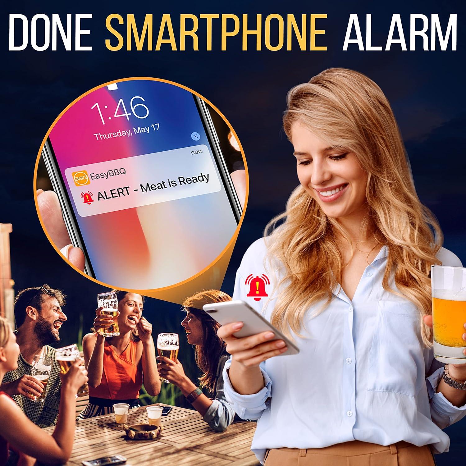 DONE SMARTPHONE ALARM: When the meat reaches the set temperature, your device will send notifications & alarm via the EasyBBQ app so you can take the meat from gas, charcoal BBQ, smoker or oven timely. Works w/ Apple iPhone / Android smartphone
