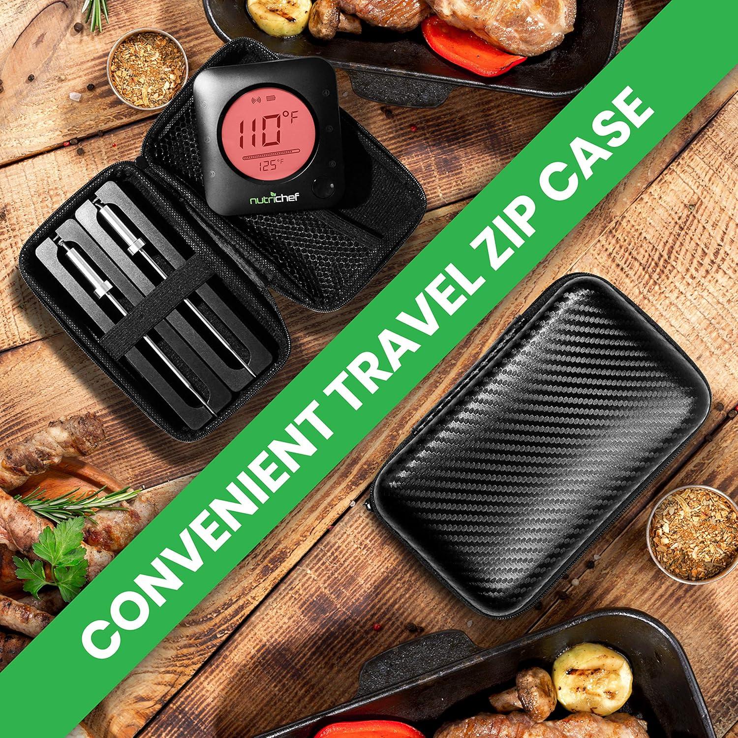 INCLUDES TRAVEL CASE: The smart cooking thermometer allows you to leave the cable and probe inside the oven or grill while cooking. Features a digital LCD display screen that shows temperature & progress. Includes a convenient portable zip carry case