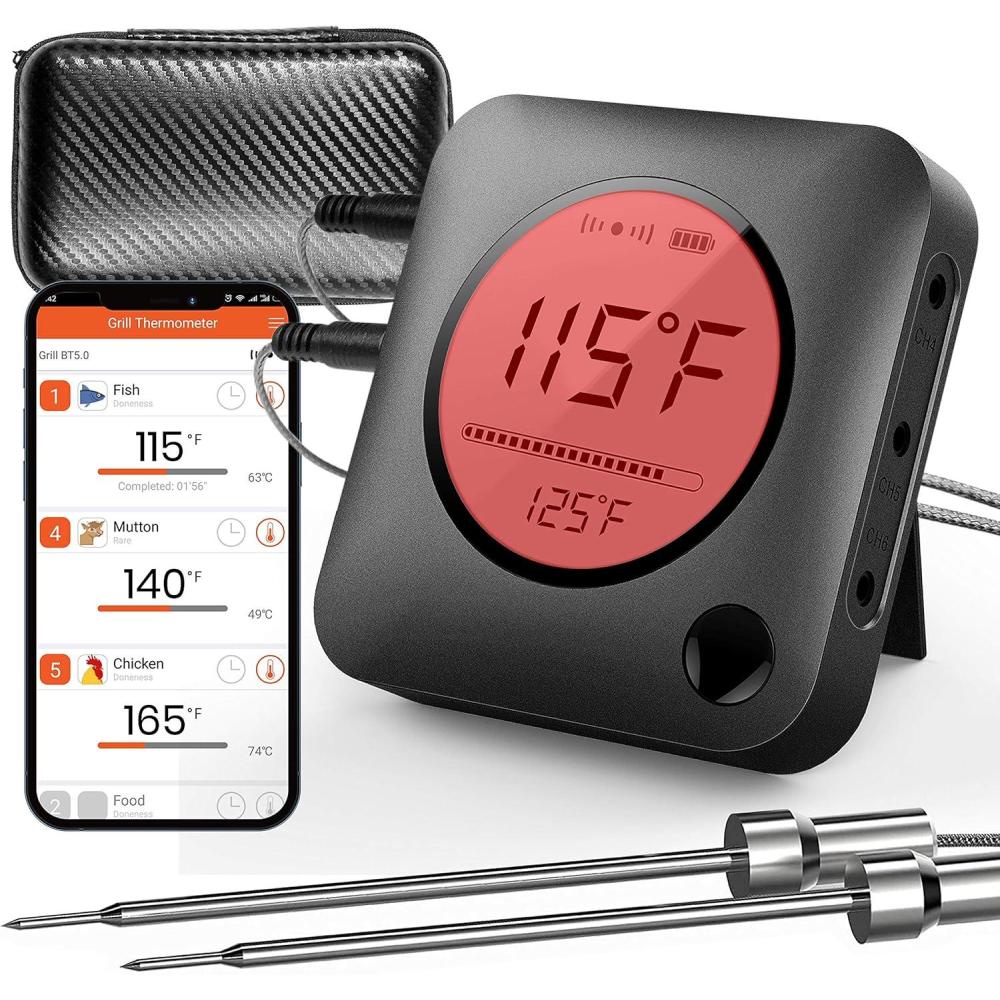 ADJUSTABLE TEMPERATURE MONITORING: The bluetooth thermometer lets you monitor temperature & get alerts for your favorite dishes. Allows you to set temperature alerts and check cook status using the mobile application. Great for steak, chicken & more
