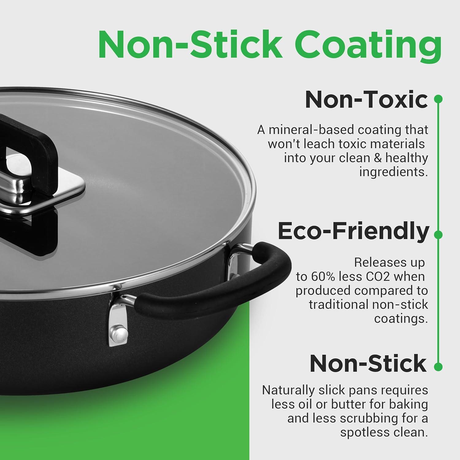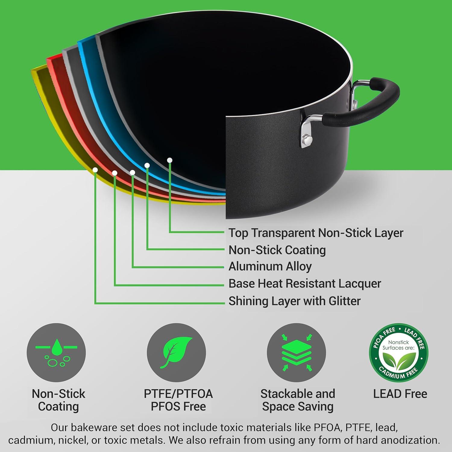 NON-STICK SURFACE: This cookware set boasts a durable, PFOA/PFOS-free non-stick coating, ensuring effortless food release, easy cleaning, and healthier cooking. Its heat-resistant lacquer exterior stands up well to high temperatures.