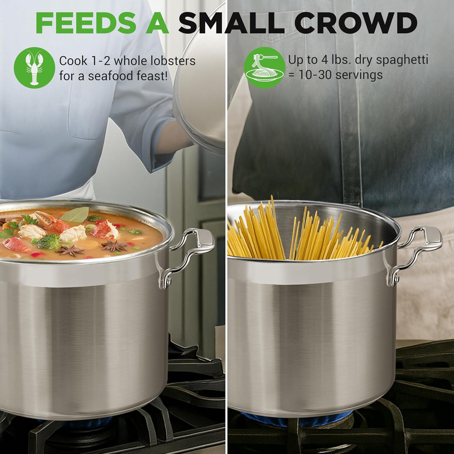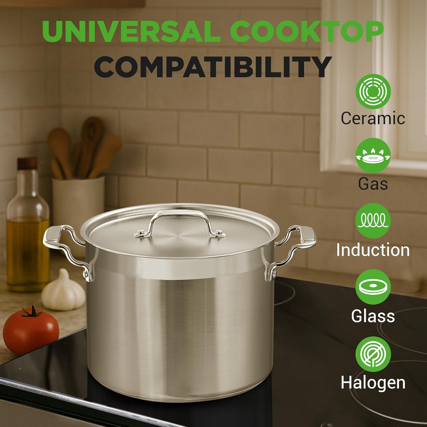 PREMIUM STAINLESS STEEL BUILD – Made from durable 18/8 material, this stainless steel stock pot with lid resists warping, discoloration, and flavor transfer. A polished mirror belt and brushed interior/exterior make it a standout piece of cookware