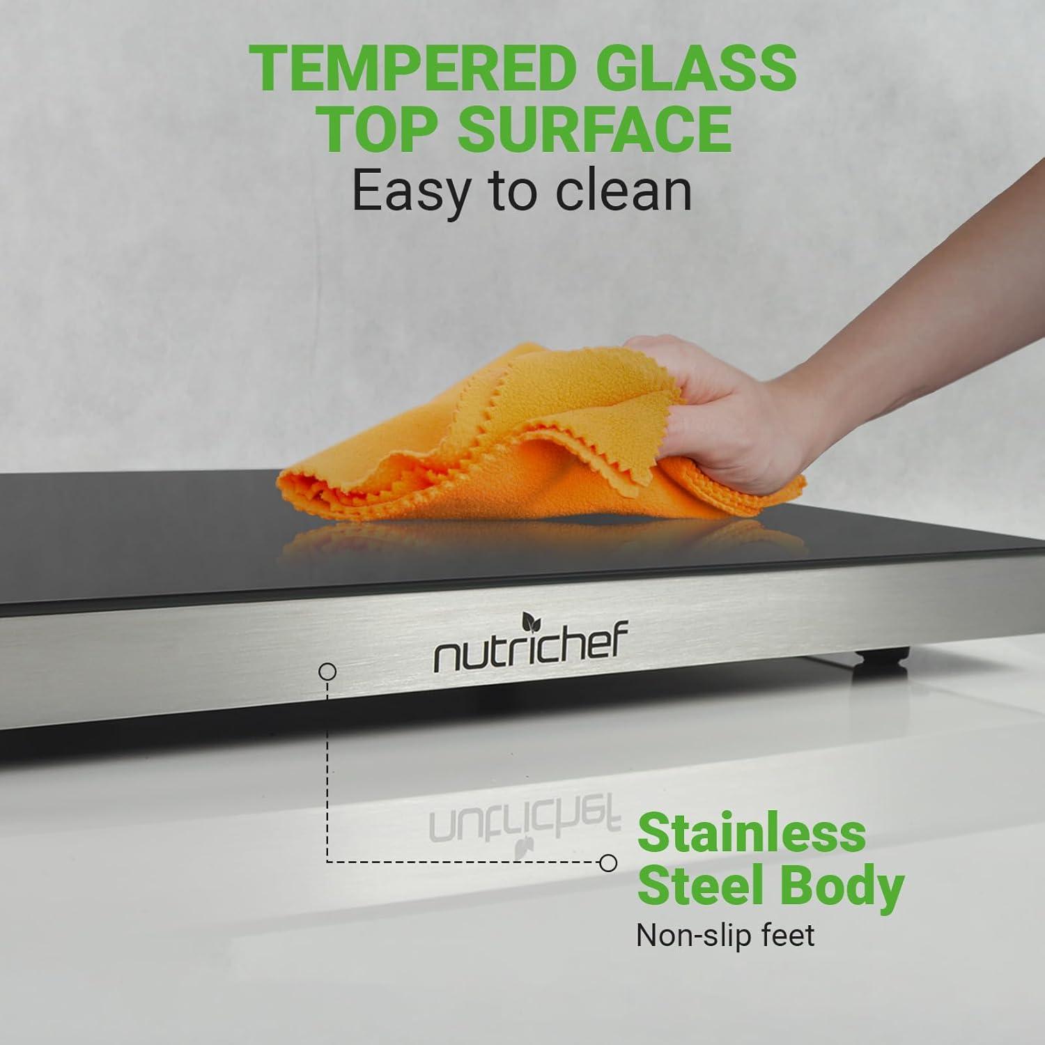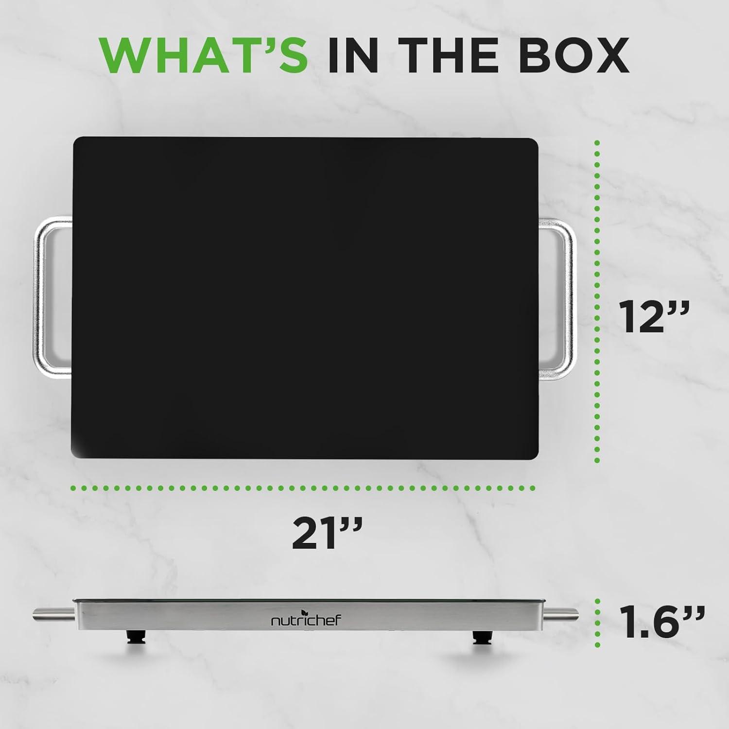 NON-STICK GLASS TOP: The food heater features heavy duty stainless steel construction, space-saving design, non-stick and heat resistant tempered glass surface w/ 16.5” L x 11.0” W heating tray size and an easy to clean surface