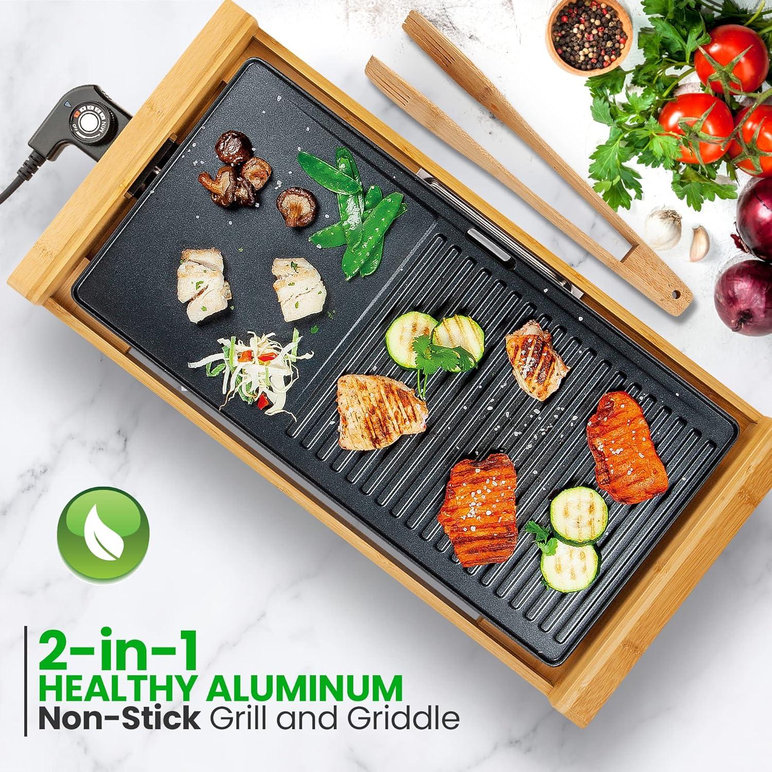SMOKELESS GRILLING: The detachable bamboo indoor electric grill is equipped with a removable oil collector that reduces virtually all hot smoke allowing you to grill food indoors without the smell of smoke lingering in your home
